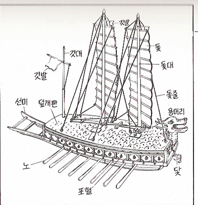 거북선은 용의 머리, 용의 몸으로 양측에 8개씩의 노와 철로된 갑판에 철창을 장치하고 있다. 또 안에서는 밖이 보이지만 밖에서는 안쪽이 보이지 안토록 설치되어 있고, 용 머리의 입으로부터는 유황을 연소 시킨 연기를 분출하여 (자함)을 감추도록 되어 있다.