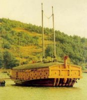 The ship was rowed with 16 oars and two sails, and the dragon-shaped head sent out smoke of burning sulfur powder in order to hide itself and confuse enemy fleet.