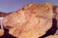 畵的構成是兩個把手張開站在大石刀旁看到相似船的形相, 給天神和地神祭祀的樣子.