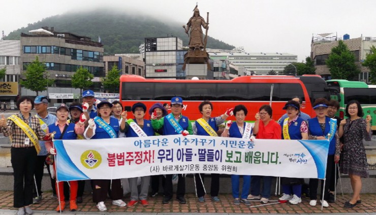 ▽지난 26일 여수시 중앙동 바르게살기협의회원들이 중앙동 로터리 앞에서 불법주정차 금지 캠페인을 벌이고 있다.