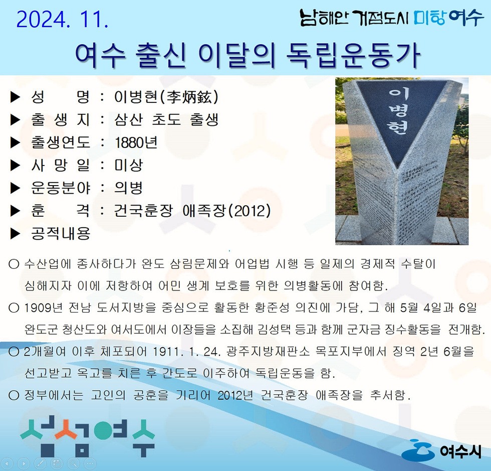 여수시(시장 정기명)가 11월의 독립운동가로 삼산면 초도 태생 ‘이병현(李炳鉉) 선생’을 선정했다.