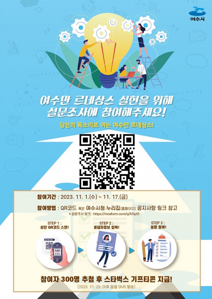여수시, ‘여수만 르네상스 종합발전계획’ 시민 설문조사 실시 11월 1~17일까지 온․오프라인 병행…여수시청 누리집 배너 링크 ․ QR코드 접속