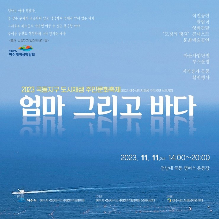 여수시 국동지구 도시재생 주민문화축제 ‘엄마 그리고 바다’가 오는 11일(토) 오후 2시 전남대 국동캠퍼스 운동장에서 열린다.