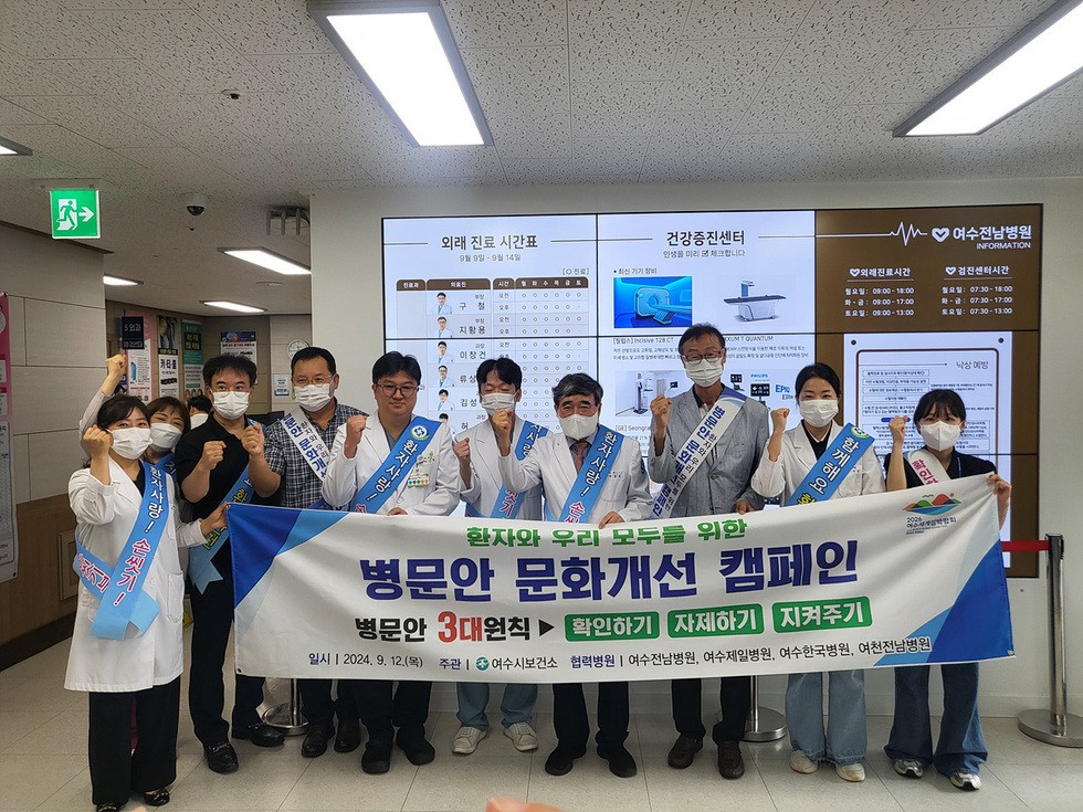 20일 시 보건소에 따르면 지난 12일 감염병 관리기관으로 지정된 여천전남병원과 여수전남병원, 여수제일병원, 여수한국병원에서 병문안객과 환자, 의료진 간 감염 위험을 줄이고 안전한 의료환경 조성을 위한 합동 운동(캠페인)을 펼쳤다.