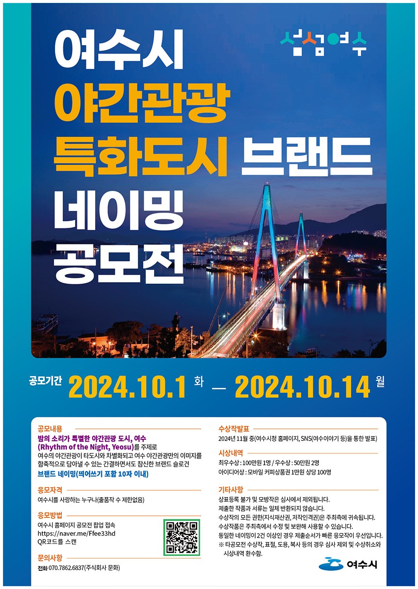 공모 주제는 ‘밤의 소리가 특별한 야간관광 도시, 여수(Rhythm of the night, Yeosu)’로, 여수 야간관광만의 이미지를 함축적으로 담아낸 간결하고도 참신한 문구를 모집한다.